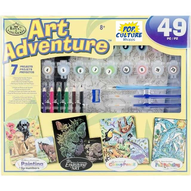 Art Adventure Super Value Set: Yellow Box by Royal & Langnickel is recommended for ages 8 to adult and includes 49 pieces with everything you need for these 7 projects and more: 2 paint by number, 2 engraving, 2 colored pencil by number, and 1 foil painting by number art projects.