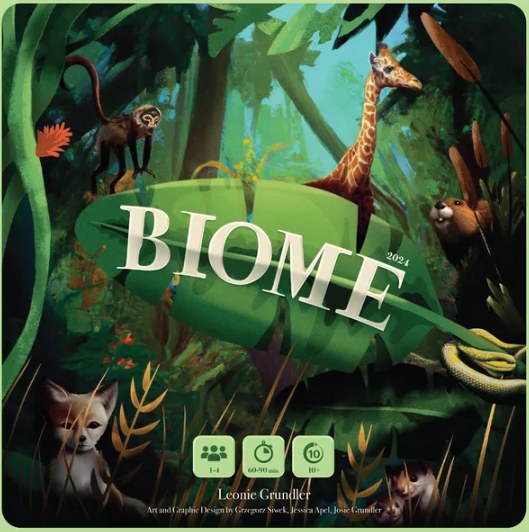 Biome, by Leonie Grundler and Lioness Games, is a strategy board game recommended for 1 to 4 players ages 10 and up and takes about 60 to 90 minutes to play.