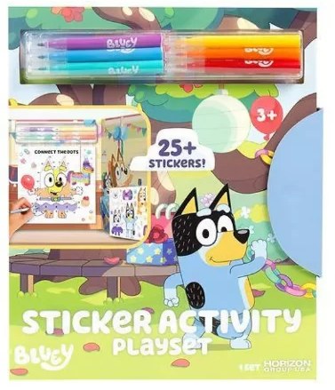 Bluey Sticker Activity Playset by Horizon Group is recommended for ages 3+ and includes over 25 stickers, markers, coloring pages, and activities.