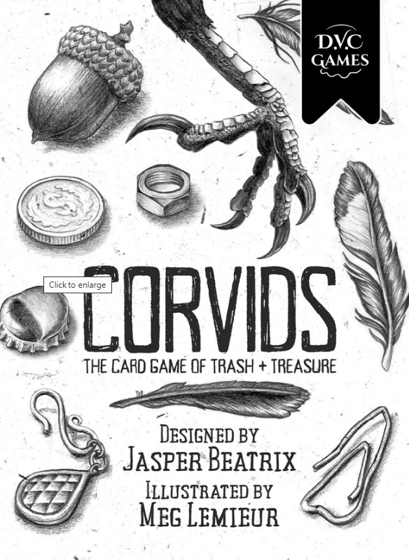 Corvids, by Jasper Beatrix and DVC Games, is a dexterity card game for 2-5 players ages 8 and up and takes 20-30 minutes to play.