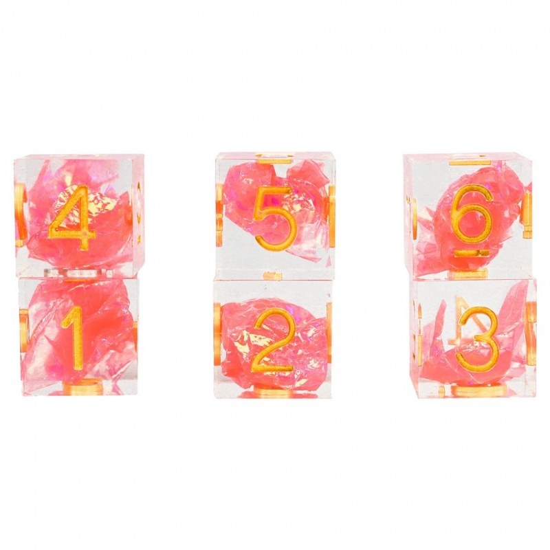 Stick your rolls with these beautiful sharp-edged D6 dice. Six (6) D6 Sharp Flamingo dice in a flat-bottomed tube. Dice are clear and feature a pink and a gold swirling ball at their core. SKU SDZ0008-03