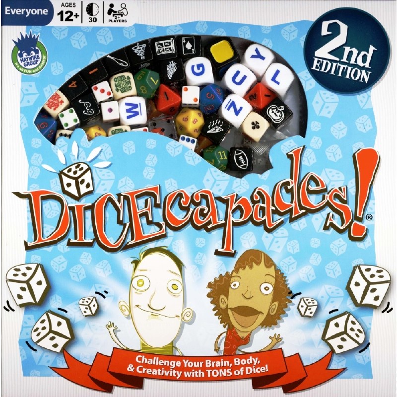 Dicecapades! by Haywire is a fun party, trivia, action, dexterity, dice game recommended for 2 or more players ages 12 to adult. Can you stack six dice on top of each other within thirty seconds? Who can be the first person to roll a triple? Can you name as many state capitals as your roll? Know what arachibutyrophobia is? Arachibutyrophobia??? DICEcapades which includes a mixture of dice games, physical challenges, artistic creations, and trivia questions doesn't involve just the luck of the dice, but also the smarts of the roller!