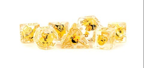 Cat Dice 16mm Resin Poly Dice Set Cat dice are infused with cats! These are full-sized 16mm polyhedral dice sets that come with 7 dice.
