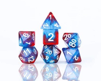 Polyhedral 8-Die set by Sirius Dice. Contains a full set of 7 Celestial - Starry Skies dice with White Numbering, plus a bonus D-20 in Purple with Glitter with White Numbering. Comes packaged a plastic tube. SKU SDZ0019-03
