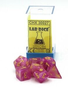 Polyhedral 7-Die set by Chessex. Glow in the Dark Lab Dice Luminary Leaf Fuschia/yellow. CHX 30027