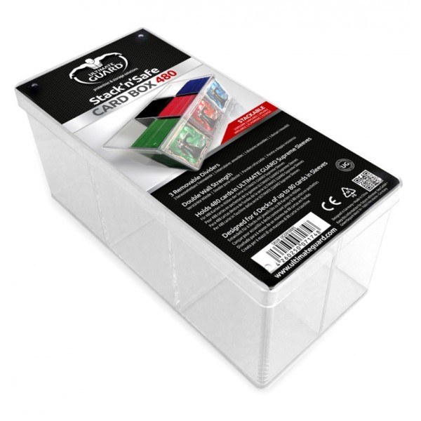 Ultimate Guard Stack 'n' Safe Card Box holds 480 standard-sized cards in sleeves. Designed for 6 decks of up to 80 cards in sleeves each, with 3 removable dividers, and clear double wall strength.