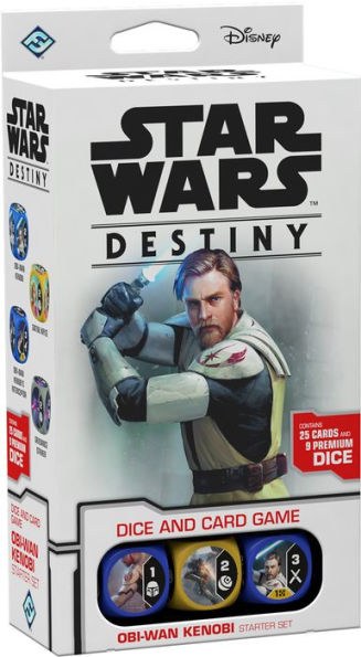 Star Wars Destiny Obi-Wan Kenobi Starter Pack by Fantasy Flight contains 24 cards and 9 premium dice, tokens and everything needed for ONE player to start playing the dice and card game.