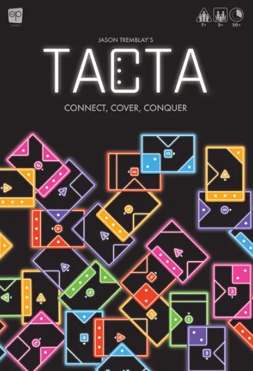 Tacta, by The OP Games, is a fast-paced card game of strategy and spatial mastery recommended for 2 or more players ages 7 and up and takes about 20 minutes to play.
