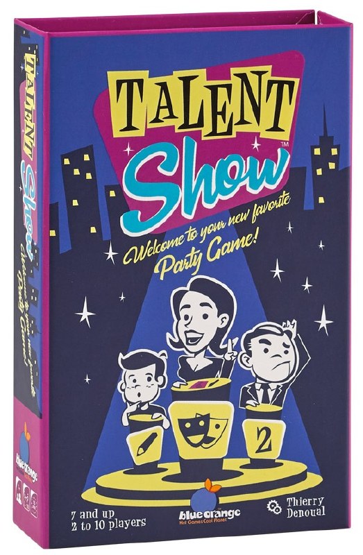 Talent Show by Blue Orange Games is recommended for 2 to 10 players ages 7 to adult and plays in about 20 minutes.
