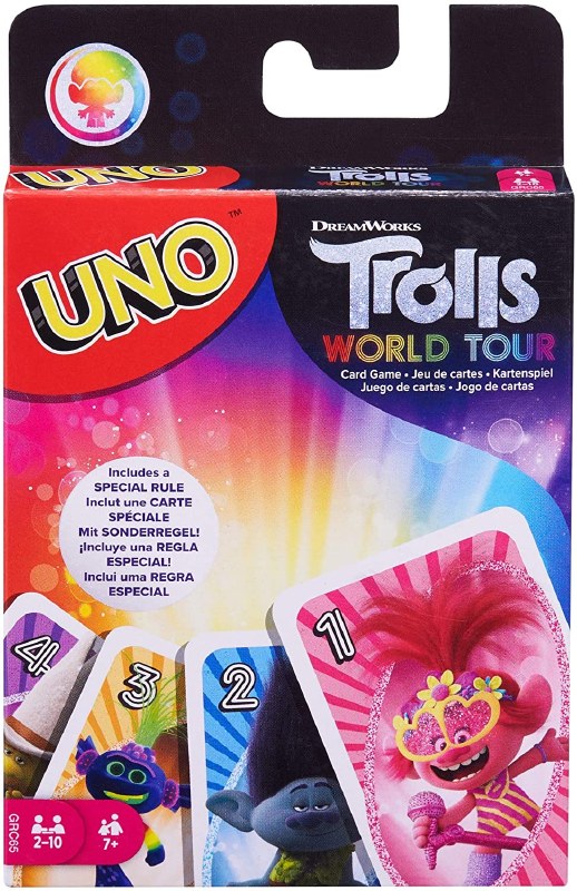 Uno: Trolls is the UNO you know but with characters from Dreamworks' Trolls World Tour. The deck includes a special "Tiny Diamond's Mix Tape" rule that forces the next player in order to draw a card from each of the other players' hand. Just like traditional UNO, everyone races to get rid of their cards by matching a card in their hand with the top card on the discard pile. Score points by being the first to get rid of all the cards in your hand. When you're down to one card, don't forget to channel the Trolls and happily yell "UNO!" This special edition of UNO makes a great gift for anyone ages 7 to adult. Colors and decorations may vary.